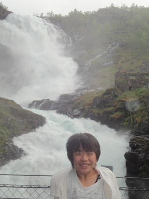 山の上から滝が流れ落ちている。 思わず、何枚も写真を撮る娘。